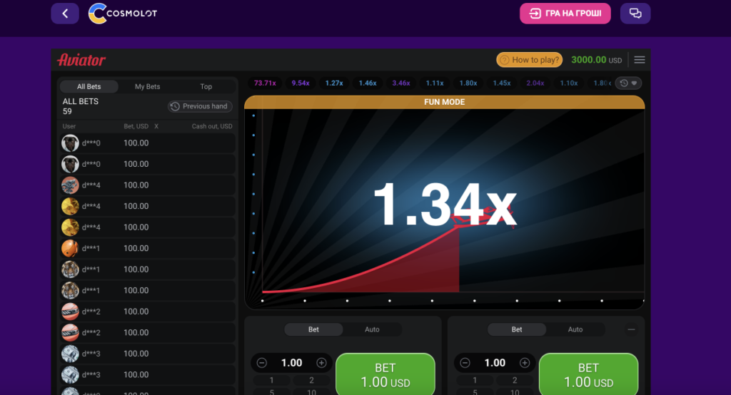 Після поповнення ігрового облікового запису в особистому кабінеті гравці мають можливість робити ставки в слоті Aviator Космолот в широкому діапазоні значень в залежності від вашої стратегії.